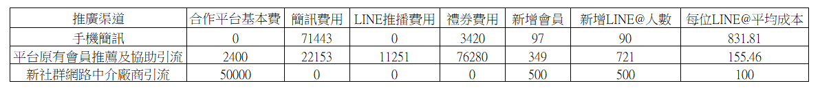 詳細結果如上圖(三) :三種推廣渠道成本與效率分析之比較所示,我們可以發現傳統廣撒簡訊的方法引流的效率最差成本也最高,每一位新增的LINE@會員成本高達831.81元,平台舊會員相互介紹新會員以及協助推廣親友LINE@綁定的效果則次之約為155.46元,而與新社群媒體網路中介廠商合作的經濟成本最低引流每位LINE@的會員成本為100元,但由於第一次合作,尚未確認引流的速度如何,我們的計劃是每月透過廠商引流進來500為新會員並且都完成LINE@的綁定,但能否每月順利達成尚未可知,因此平台原有會員的推薦與協助推廣,雖成本略高於合作廠商,但目前仍可以持續推廣,仍有其相當的價值,至於利用廣發簡訊來吸引新會員參與註冊與綁定LINE@,從去年到今年的兩次實驗結果,可以確定是既沒有效率也沒有經濟利益的選擇。